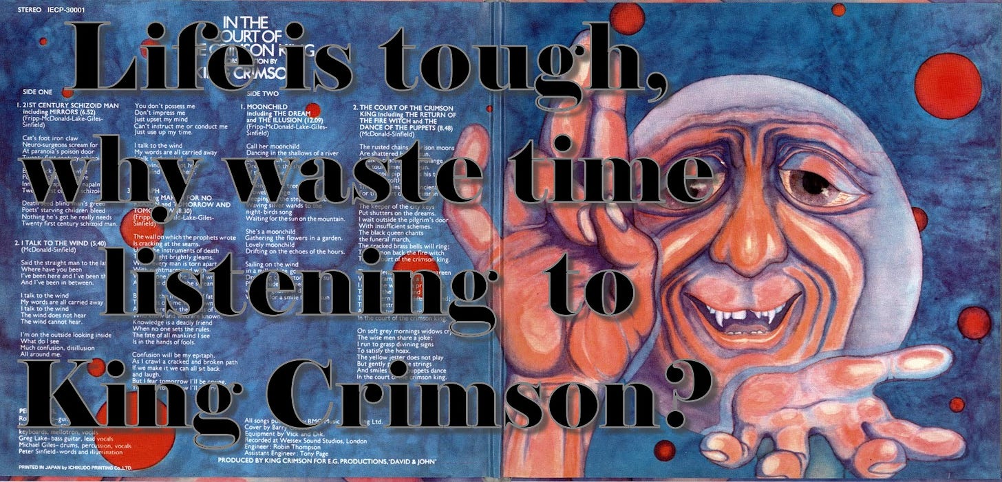 All of which is to say; not liking King Crimson doesn’t mean I “don’t get it,” (actually it does, I don’t get it) and finding Robert Fripp creepy probably is normal for the likes of me - I have a list of other creepy types. I can recognise the pseudo brilliance and snobbery, admire the ambition, and still quietly back away, preferring something with a bit more warmth, soul or sympathy for the human condition. Some might say it’s a failure of taste but it’s just knowing what kind of music you really want keeping you company. Life can be tough, why waste time with King Crimson? Protect your mental health. I did quite enjoy aspects of Giles, Giles and Fripp and the old school McDonald and Giles efforts though - and RF did some decent stuff with Eno, Bowie et alia. I’m not a complete bigot on this matter.